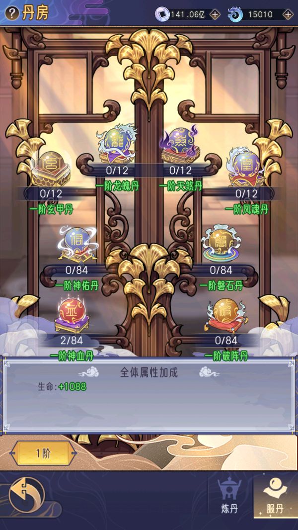 不同丹药对应了不同的增益效果,如一阶神血丹,服用后可对生命值进行加成;而一阶玄甲丹,则用于物防加成。