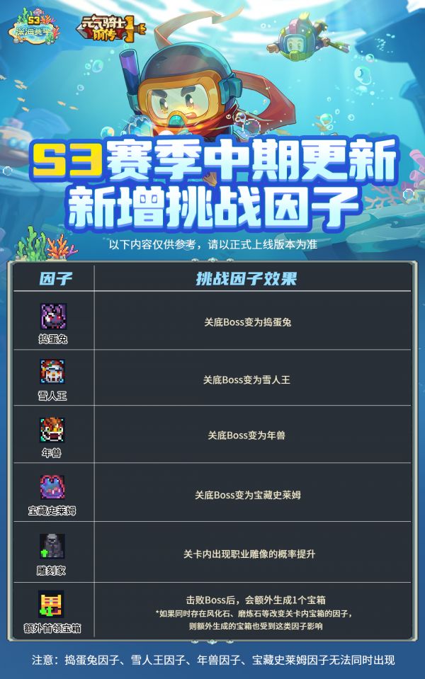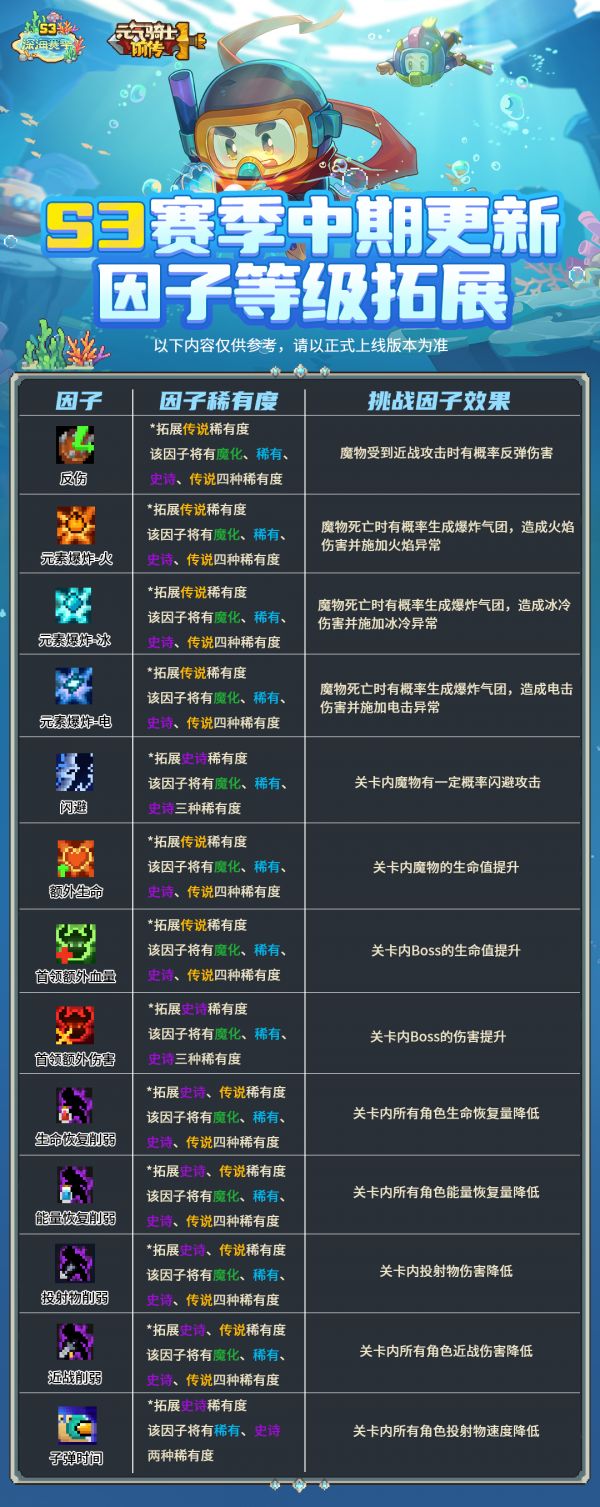 在S3赛季中期更新后我们将在游戏内新增一批挑战因子,新增因子如下: