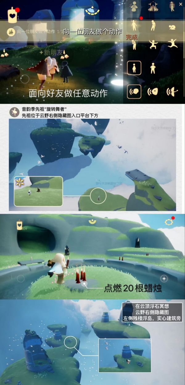 《光遇》游戏中每天的每日任务及大蜡烛的位置都不相同,玩家完成每日任务及收集大蜡烛都可以得到丰厚的兑换奖励,奖励可以用于兑换各种动作及道具,不过很多小伙伴不知道每日任务怎么做,又懒得自己去找大蜡烛的位置,我们汇总了每日任务的完成攻略以及蜡烛位置,一起来看看吧!