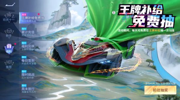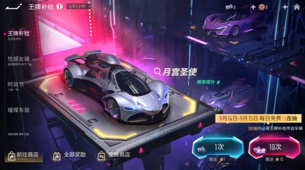 9月14日-10月6日,王牌补给免费抽2.0活动将正式开启,活动期间的每周六&周日,车手们都可以登录速度节在王牌补给进行一次免费十连,合计免费80抽!