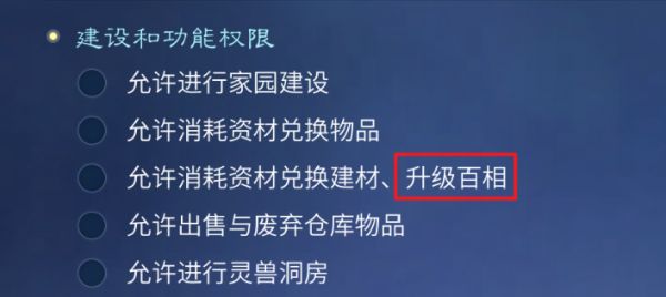 A我们已为您追加此房客权限。点击“家园-厢房-厢房信息-房客权限”,取消勾选“允许消耗资材兑换建材、升级百相”这一项权限(此权限默认不开启)。10月版本后我们将独立出一项“允许消耗资材升级百相”的新房客权限。