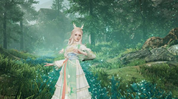 裙面碧色布帛之上,九色鹿刺绣栩栩如