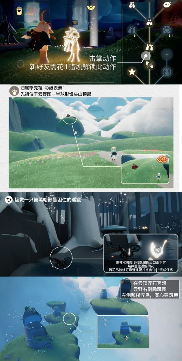 《光遇》游戏中每天的每日任务及大蜡烛的位置都不相同,玩家完成每日任务及收集大蜡烛都可以得到丰厚的兑换奖励,奖励可以用于兑换各种动作及道具,不过很多小伙伴不知道每日任务怎么做,又懒得自己去找大蜡烛的位置,我们汇总了每日任务的完成攻略以及蜡烛位置,一起来看看吧!