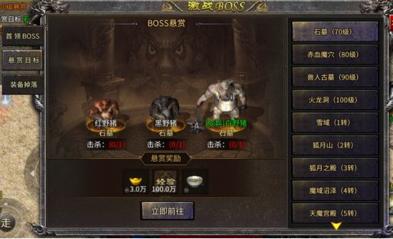 当角色达到70级即可开启悬赏BOSS系统,击杀对应BOSS即可获得大量元宝,经验以及腊八粥提升修为。玩家前期可先完成悬赏目标提升免费会员,点击立即前往即可传送到对应地图进行击杀。