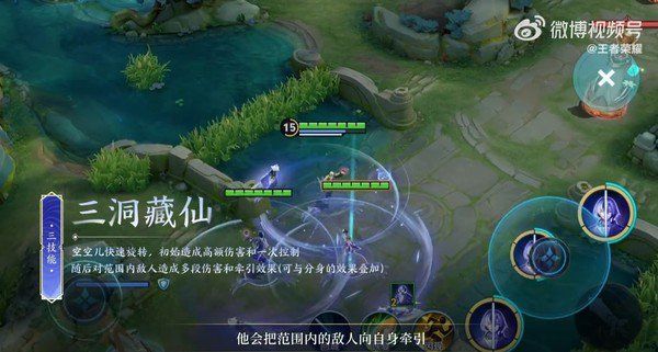 三技能:三洞藏仙,空空儿快速旋转,初始造成高额伤害和一次控制,随后对范围内的敌人造成多段伤害和牵引效果,可与分身效果叠加。大招开启时会自动释放一二技能,刷新分身的持续时间,期间空空儿会快速累积能量,并能和分身换位。
