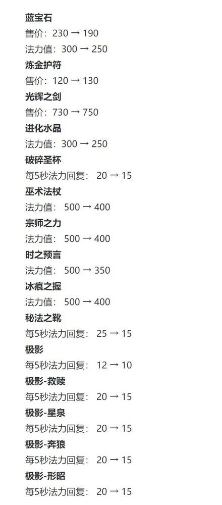 新赛季英雄蓝量也做出了调整,技能蓝耗统一调整为不随技能等级成长,同时配合英雄的基础蓝量调整,让每个英雄在成长期的蓝量消耗相对更为平衡,不会出现以前对线刚释放几个技能就没蓝需要回家的尴尬。与此同时,随着技能蓝耗整体下降,回蓝装备的价格也做出了调整,一些装备每5秒法力回复的量也进行了降低处理。