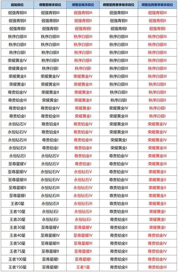 上个赛季可能不少玩家赛季末努力冲分,为了新赛季能够继承一个相对较高的段位,让上分容易一些。不过本赛季的继承机制做了调整,调整了起始段位为尊贵铂金二——荣耀王者150星以上的段位继承方式。其中,有几个明显的分界点,铂金二由原来的铂金五调整为黄金一,钻石一由原来的钻石五调整为铂金二,王者10星由钻石一调整为钻石二,王者150星由星耀一调整为王者一星。