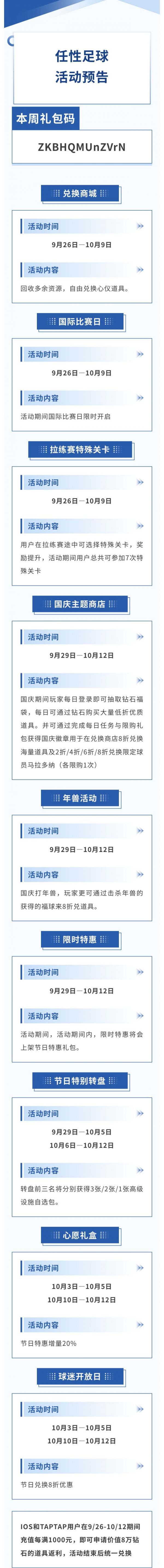 活动一:兑换商城;活动二:国际比赛日;活动三:拉练赛特殊关卡;活动四:国庆主题商店;活动五:年兽活动;活动六:节日特别转盘;活动七:球迷开放日;