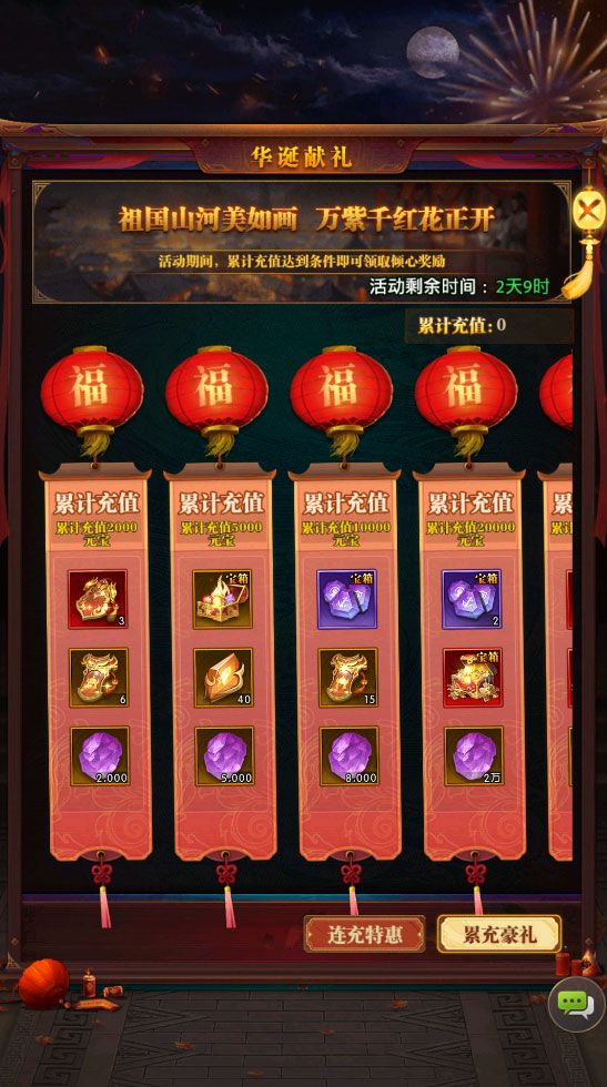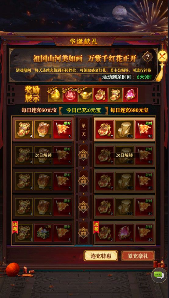 活动内容:活动期间,累计充值达到条件即可领取倾心奖励,各种珍稀物品等你来拿~而且每天连续充值到不同挡位,可领取好礼,若主公漏签,可进行补签哦~