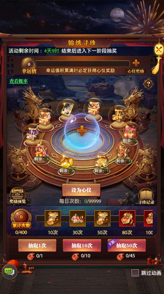 活动内容:活动期间,消耗限定活动道具,即可抽取心仪活动奖励,累计幸运值满时必定获得心仪奖励哦!觉醒皮肤,皮肤自选箱,美人碎片自选箱、专属武器、珍稀材料等一应俱全,只待你将它们收入囊中。