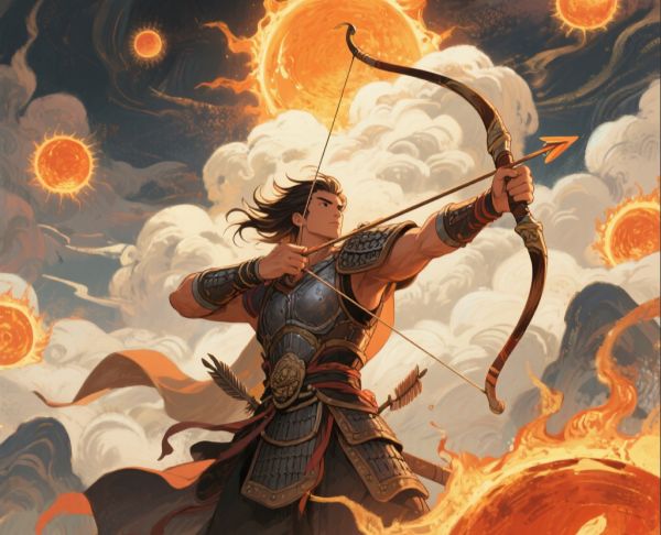 有一天,天空升起十个太阳,烈焰焚地、河流干涸,人们苦不堪言。后羿四处除妖,杀掉了九婴、封豨、大风、修蛇等大妖,暂时平息了灾难。后来他得到神弓,射落九只三足金乌,保全了人族。最后一只金乌,他没有射,让天地恢复平衡,但他知道,暗中仍有妖魔在等待时机。
