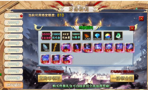 这个付费点跟前面的对比是一个全新的付费点,奖励内容主要是材料和属性并且可以逐级购买(前面付费点都氪了的话可以直接用领奖额度领前面2档)最高可购买一万倍的奖励 可以一边刷怪搭配这个来减轻负担 也可以一次性花费328元直接打包所有档位直升49大陆