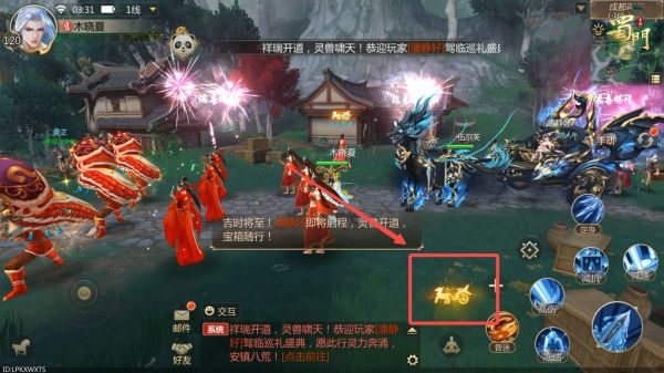 巡礼开启后将会昭告天下,全服蜀友均可看到巡礼开启公告。前往成都西郊地图后,界面右下方会出现一个马车图标,点击图标便能自动寻路至巡游地点,与战力王者共同巡游守护蜀山。