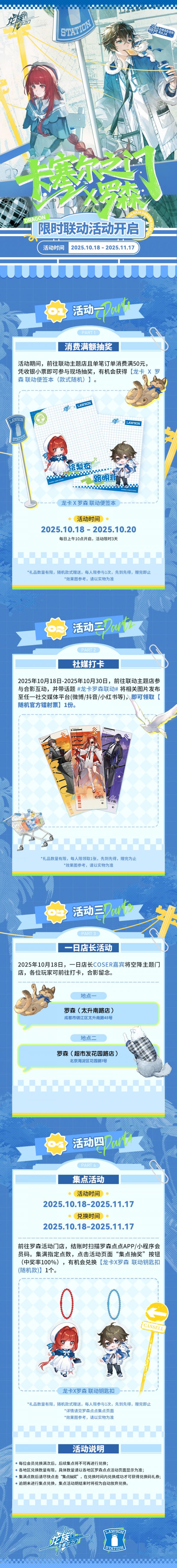 活动期间,专员们前往「罗森联动主题店」参与社媒打卡、现场抽奖、COSER合照留念等活动,即有机会获取「全新联动便签本」、「随机官方镭射票」。同时,前往「罗森集点活动店」参与集点抽奖,即有机会兑换「全新联动钥匙扣」!