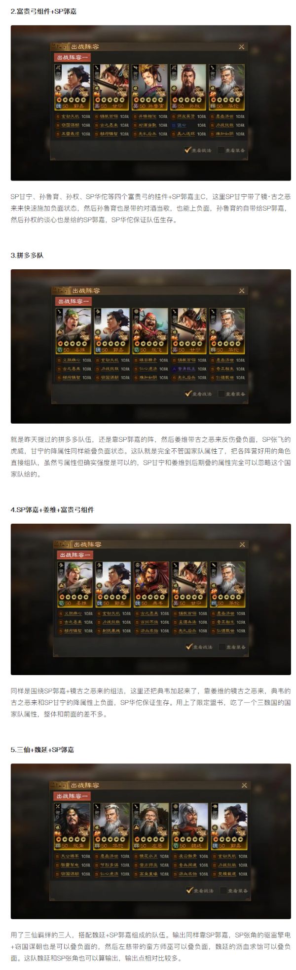 测试服开启棋道会16进8的比赛。在胜者队伍里,可以发现一个规律,就是除了一个玩家没有用SP郭嘉之外,其他人全部用了SP郭嘉。(测试服必须要用新武将,新武将范围是SP张飞、SP黄忠、夏侯尚、潘氏、SP郭嘉、SP马超)。受镜古之恶来的影响,其他兵刃新武将在棋道会环境强度不高,于是很多人选择SP郭嘉的阵,以及镜古之恶来为核心思路来组队。