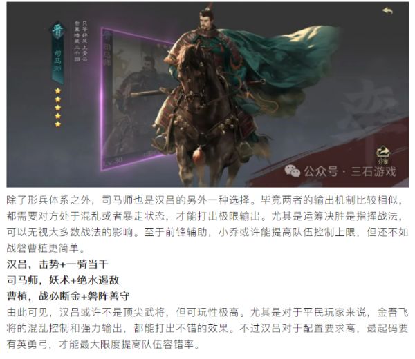 在率土之滨中,汉吕一直都是非常给力的武将。不仅有优秀的面板属性,还有给力的主战法,属于攻防兼备的强力武将。也许很多玩家觉得汉吕的谋略短板非常明显,容易遭到谋略队伍的克制,可实际上只要汉吕的速度足够快,保证先手行动,大概率可以控死对方。毕竟金吾飞将强力的两回合混乱控制,足以牢牢掌控节奏。而汉吕的速度成长值高达2.02,仅次于张辽、公孙瓒等少数武将。另外,如果目标处于暴走或混乱状态,金吾飞将还能打出双倍暴击,堪称完美。