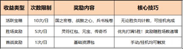 集中火力手动打赢5场 → 剩余5场活跃可挂机速刷(节省时间)