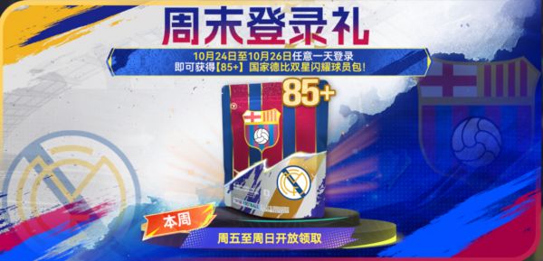 10月24日-10月26日任意一天登录,即可获得【85+】国家德比双星闪耀球员包。