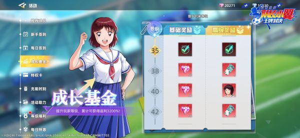达到指定等级,即可免费领取基础奖励彩钻;付费解锁高级奖励后可获得SSR球员-【新田瞬】以及大量护具召集券