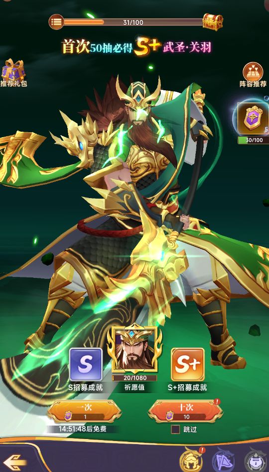 武将招募中每招募30次必定招募一个S级武将,每招募180次必定招募一个S+级武将。新玩家首抽50次,必得S+武圣关羽,一员大猛将,大家不要错过呀!
