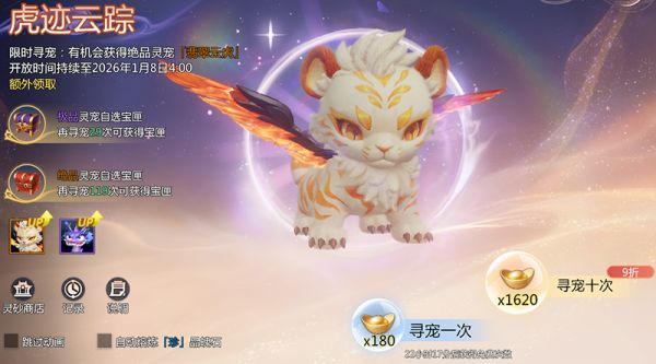 限定寻宠·虎迹云踪开启,全新灵宠翡翠云虎(初始5魄石)、雷虚子 (初始3魄石)登场,少侠可通过 「虎迹云踪」限定寻宠可以获得。玄武真君、玲珑羽兽进入万象聚灵寻宠。