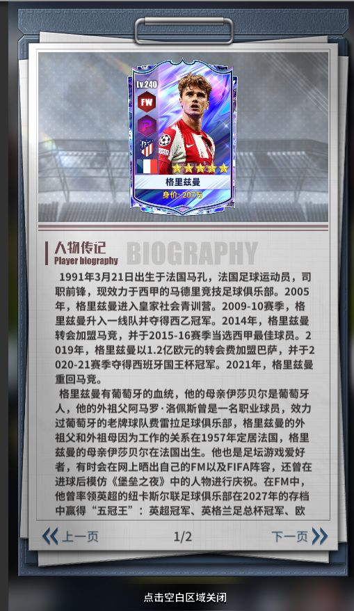 格里兹曼,1991年3月21日出生于法国马孔,法国足球运动员,皇家社会青训出身,司职前锋,现效力于西甲的马德里竞技足球俱乐部。