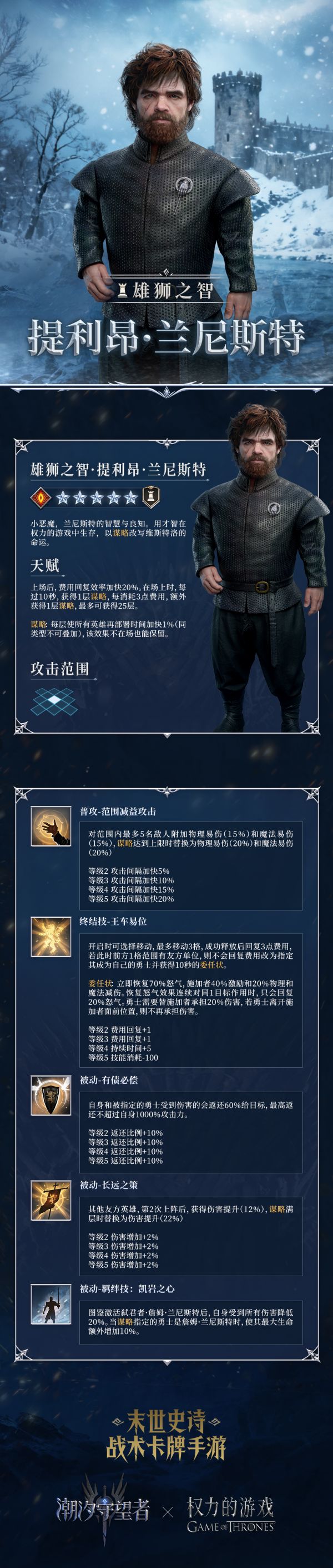 小恶魔,兰尼斯特的智慧与良知。用才智在权力的游戏中生存,以谋略改写维斯特洛的命运。