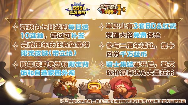 小骑士们好,游戏内七日签到今天开始啦,可从游戏【主菜单】-【周年庆典】-【庆典赠礼】处查看并领取哦!