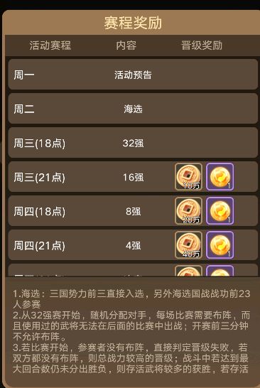 2. 从32强赛开始,随机分配对手,每场比赛需要布阵,而且使用过的武将无法在后面的比赛中出战:开赛前三分钟不允许布阵。