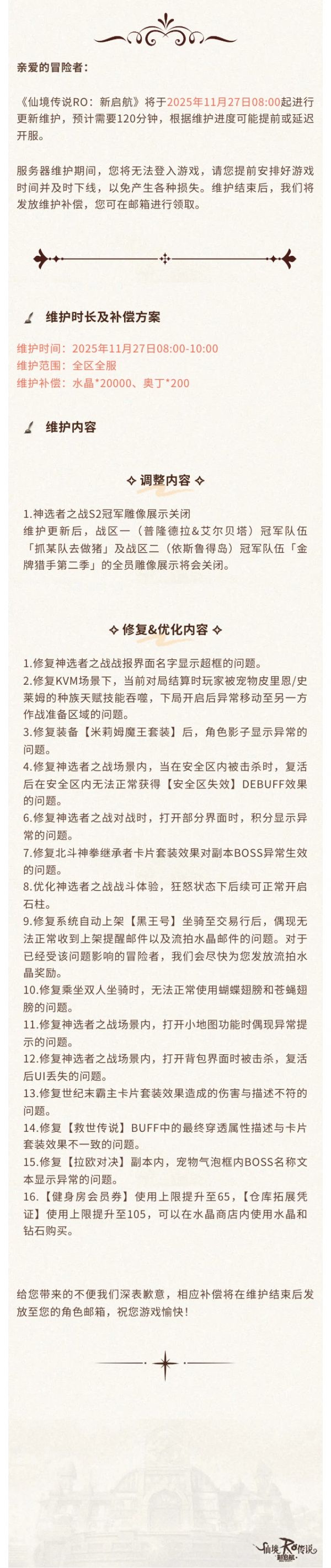 《仙境传说RO:新启航》将于2025年11月27日08:00起进行更新维护,预计需要120分钟,根据维护进度可能提前或延迟开服。