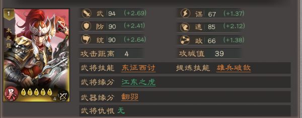 自带技能“东征西讨”是核心亮点:50%概率对敌军单体发动2次独立判定的兵刃攻击,完美契合“东征西讨”的突击爆发特性,是吴国阵容里的“双段伤害收割机”。