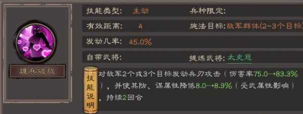 • 效果:对敌军单体连砍2次(伤害率75.0→83.3%),双段独立判定能稳定打高爆发,是太史慈的核心输出手段。