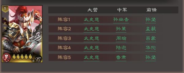 1. 江东弓流:大营太史慈+中军孙尚香+前锋孙坚(凑“江东之虎”缘分,双输出+孙坚承伤)