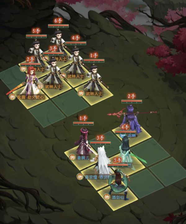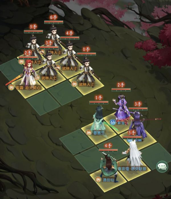 龙幽放3号位,龙幽普攻“戟骨突”对纵列目标造成伤害,并无视其20%防御,被动“一往无前”攻击每穿透一个目标,对后续目标增加30%伤害,放在3号位可以直接打击一整列目标,且自身被动“醉仙望月步”命中目标时,有33%概率进行连击,前期尽可能的在首回合或第二回合触发一次连击,即可让南宫煌补刀全清场上右侧纵列武林人士,便于后续伙伴减少场上武林人士带来的伤害,专心对玄霄造成伤害。