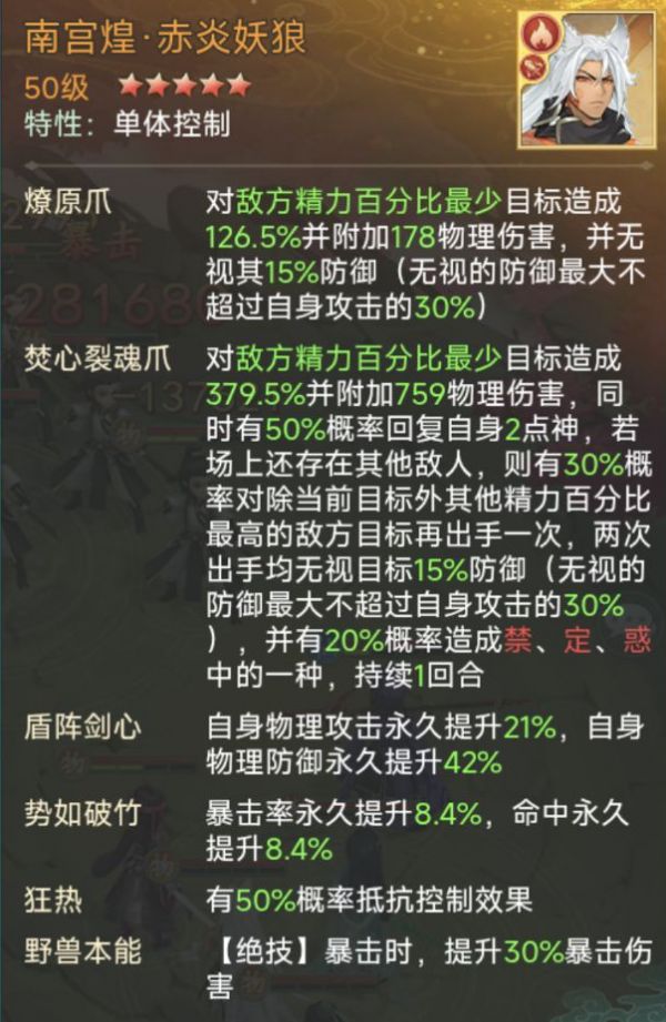 南宫煌·赤炎妖狼放4号位,普攻“燎原爪”对敌方精力百分比最少目标造成伤害,前期(补刀),绝技“焚心裂魂爪”同样对敌方精力百分比最少目标造成伤害,绝技有50%概率回复自身2点神(打高分需凹,确保姜婉儿/紫萱眩晕玄霄以及玄霄绝技避开对南宫煌造成致命伤害),关键2点神可让南宫煌·赤炎妖狼在第五回合时,再开一次绝技,自身被动“野兽本能”绝技暴击时,提升30%暴击伤害,进一步拉高总分值。