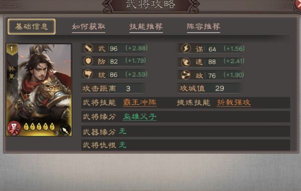 孙策定位是核心输出型武将(T1梯队),自带技能“霸王冲阵”是他的核心卖点:
