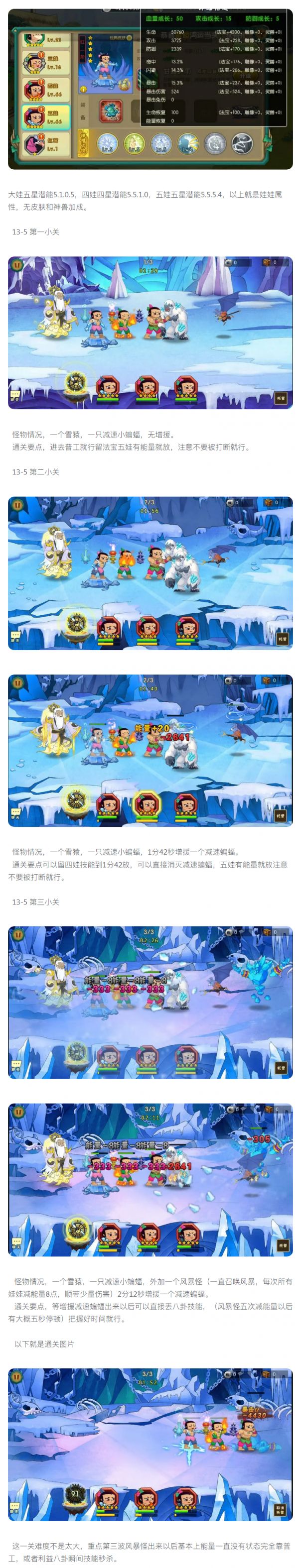 13-5我用的阵容是145带八卦,无食物,无村庄加成,无坐骑加成,145娃娃法宝俩星附身娃娃,八卦器灵3级,1.4.5娃娃红一空装备,以下是娃娃属性图。