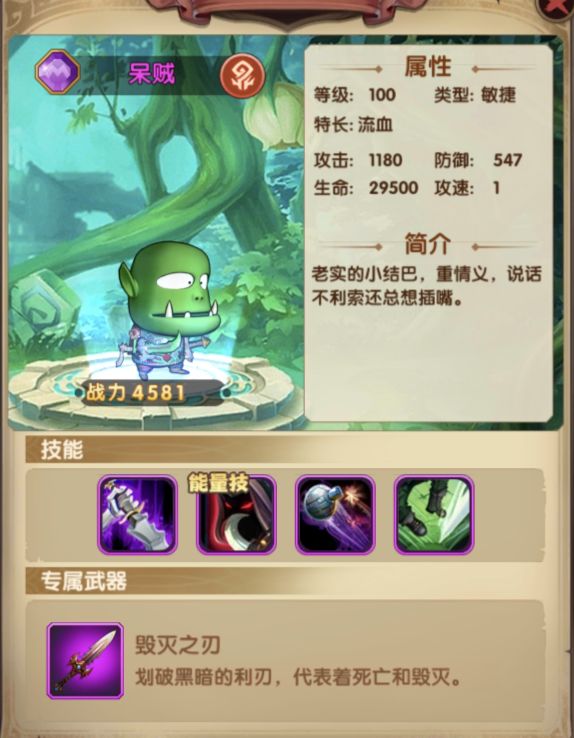 呆贼:初期最少养成一个紫色品质,用来打25关卡的boss,流血有奇效