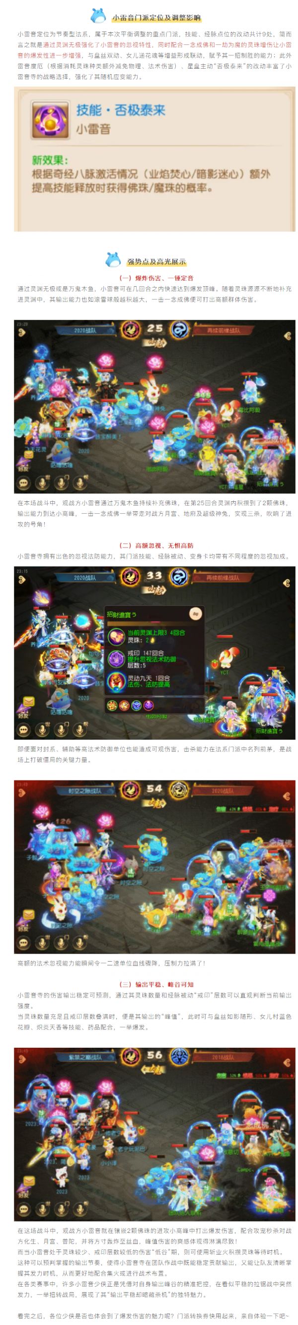 要说年末战斗平衡调整后,什么门派最炙手可热,不少少侠的答案定是小雷音吧~此次调整不仅大幅提升了该门派的忽视法防能力,还加强了一念成佛、一劫成魔等核心技能的伤害系数,让小雷音在巅峰赛中贡献了不少暴力美学瞬间,今天灵儿就带各位少侠来鉴赏一下吧~