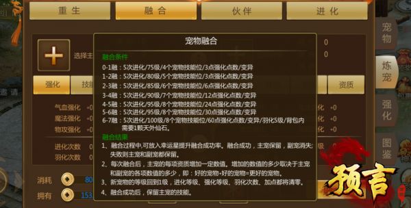 ​6、本次更新后将开放7融宠物,需5次进化/100级/8个技能位/60点强化点数/变异/羽化5级,额外还需要一颗天外仙石,此物品在通天塔内击败BOSS有几率可获得,详细介绍请查看预言手游内宠物融合系统说明,如图: