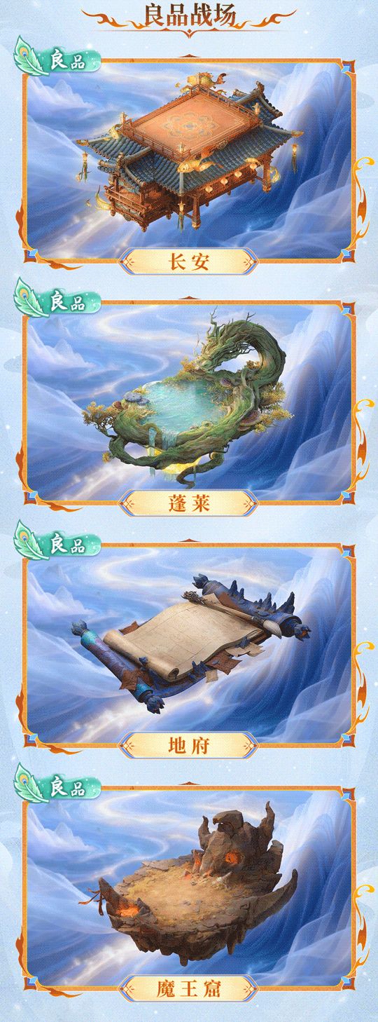 良品战场涵盖长安、蓬莱、地府、魔王窟四大经典场景,朱楼画栋的长安尽显大唐盛世繁华;“有龙则灵”的蓬莱透着缥缈仙气,肃穆神秘的地府与粗犷霸气的魔王窟也各具独特氛围感,每一处场景都能带来不一样的沉浸式对阵体验。