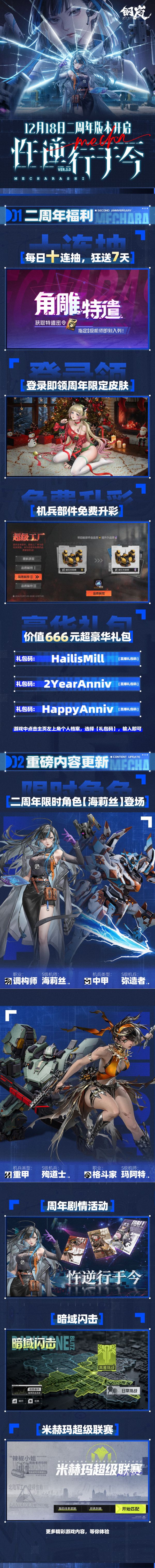二周年福利,每日十连抽,狂送7天! 超级工厂限时回归,可升阶机兵部件至彩色品质 二周年限时角色海莉丝登场! 二周年剧情活动「忤逆行与今」上线! 开放全新大型玩法「暗域闪击」