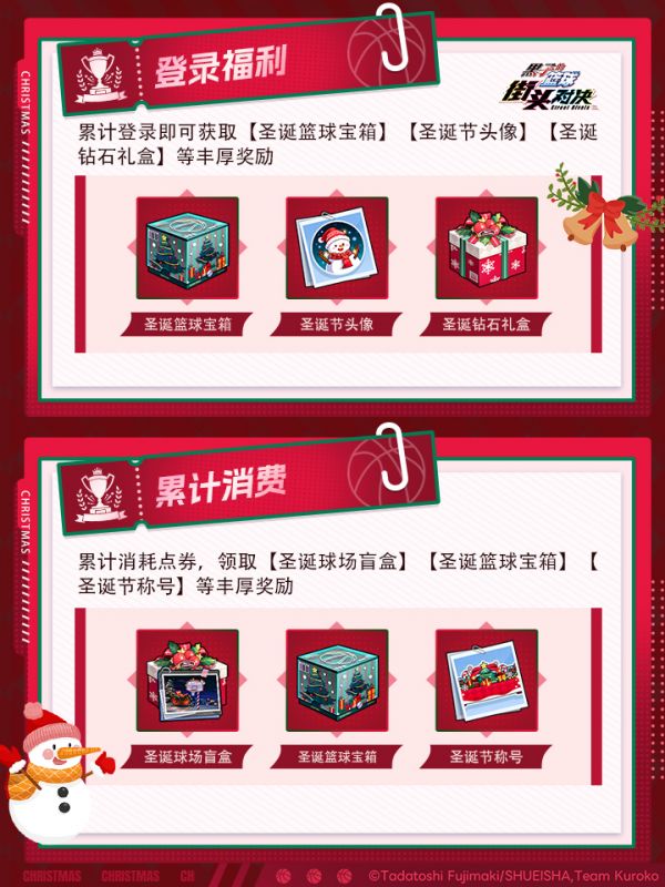 《黑子的篮球:街头派对》圣诞派对活动即将在2025年12月25日-2026年1月7日期间开启!圣诞节头像&头像框、圣诞节称号、圣诞篮球宝箱、圣诞球场盲盒、夺宝券自选箱、黑子哲也-冬日铃声皮肤和阿列克斯-圣诞女郎等超多圣诞好礼正等待你来解锁。