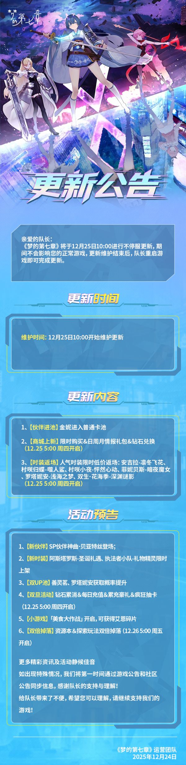 请各位队长合理安排游戏时间,避免不必要的数据损失。维护完成后,我们将通过游戏内邮件为大家发放物资补给,请及时查收。让我们共同战胜噬梦之蛇,保护维纳斯陷阱的和平吧!