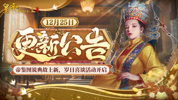《皇帝成长计划2》于12月25日(周四)早上07:00-10:00(根据实际情况,可能存在一定提前或延迟)进行本周的版本更新(期间可正常登录游戏),如有变动一切以游戏内正式公告为准。