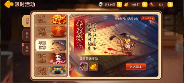 活动内容:活动期间开放“平定江东”限时副本,每日首通获得奖励。