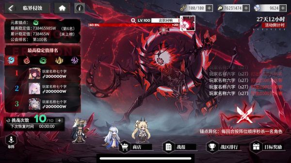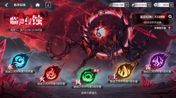 多人PVE玩法,抢占BOSS区。唤醒者在全服讨伐指定BOSS中,根据进度和伤害计算排名。可以选择元素加成,选择后不可更改,不同元素加成阵营之间排名独立。