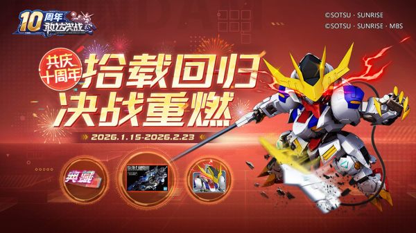 十周年专享服活动,重返敢达世界,VIP经验1:1返还! 十周年玩法翻倍:各玩法产出3倍加成,资源领到手软! 十周年回归冲刺,海量宇宙资源宝箱等待开启! 十周年回归专享,召回好友重燃决战,经典高达模型免费送! 十载回归,历史充值返还回馈开启,速来领回馈积分兑换海量豪礼!