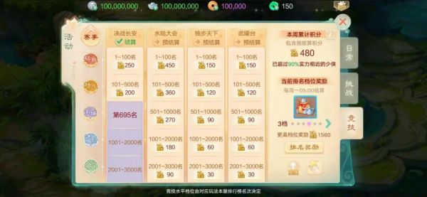 3)每周根据总积分进行竞技档位划分,可领取对应分档的银两或物品奖励;
