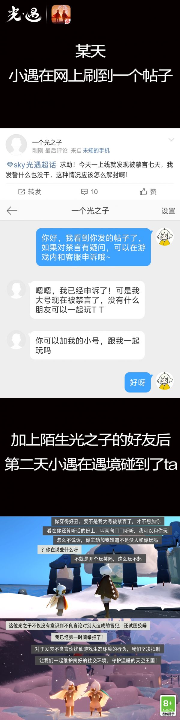 我们将不遗余力地对《光·遇》游戏环境进行监测与净化,也由衷希望更多旅人能够加入到共同守护天空王国的努力中来。